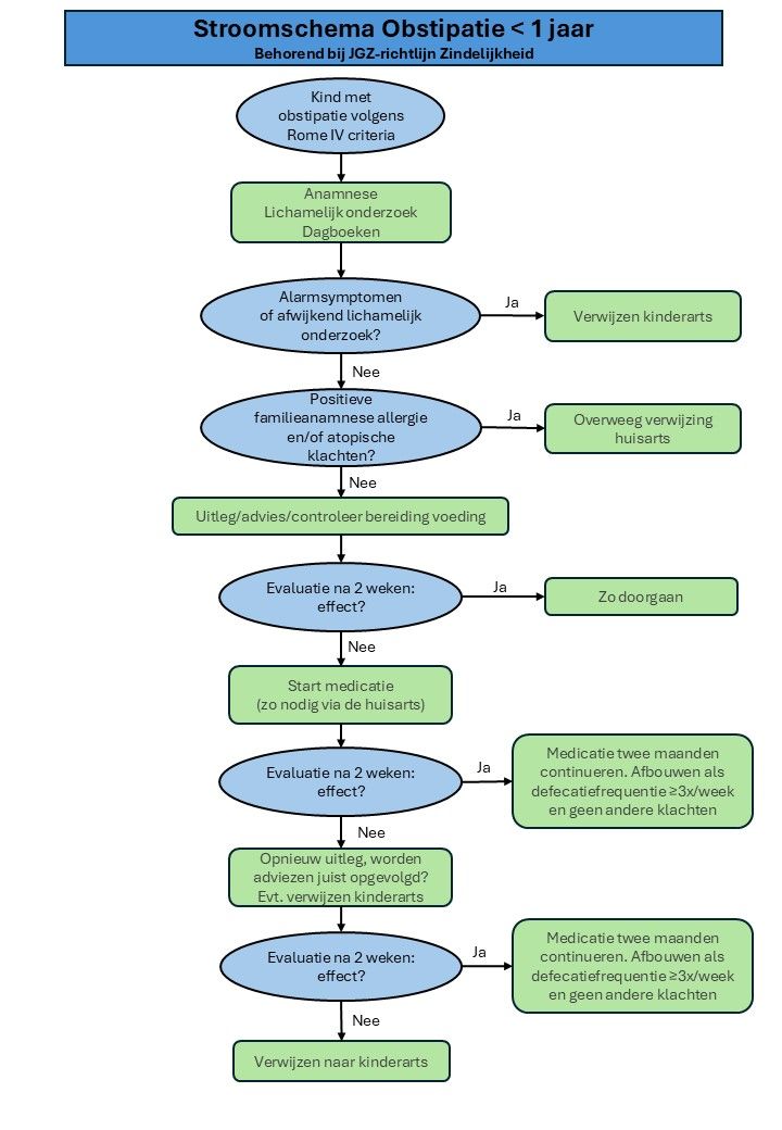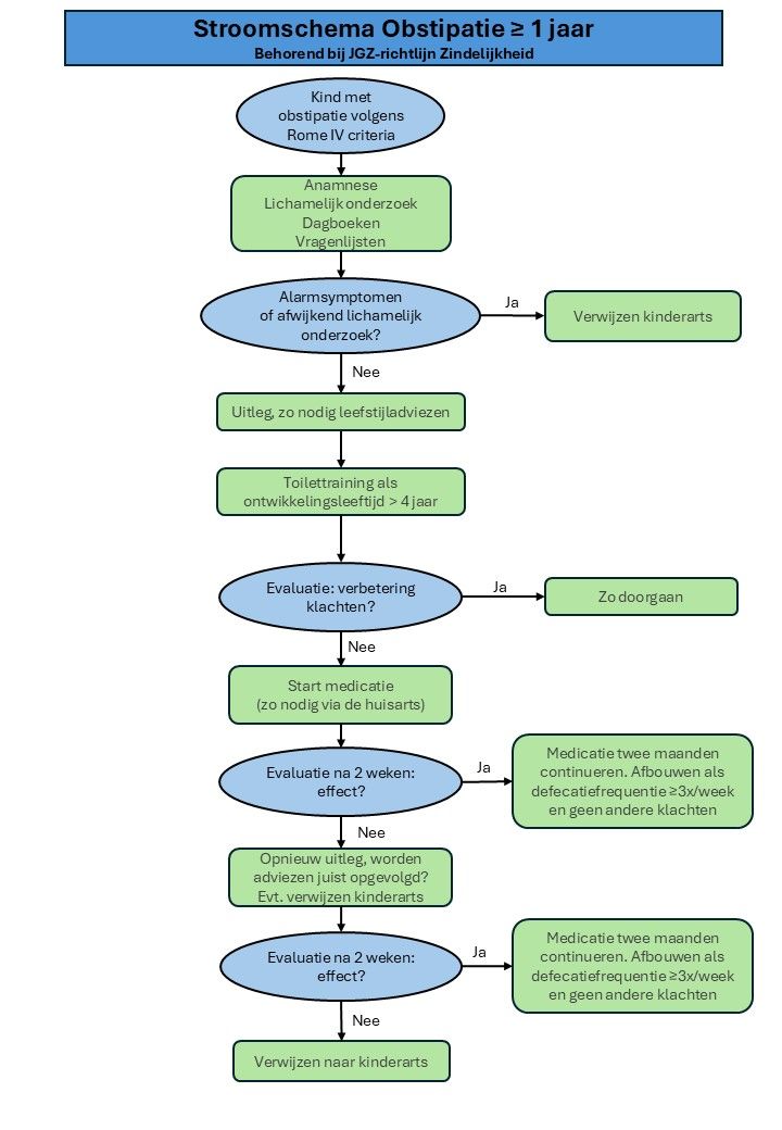 De richtlijn laat ruimte voor de jeugdarts/ verpleegkundig specialist/ jeugdverpleegkundige om vrij verkrijgbare medicatie te adviseren als er sprake is van obstipatie.