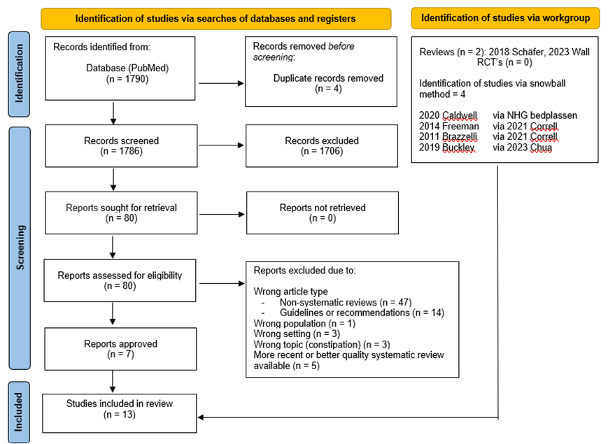 Startpunt voor de search was de JGZ-richtlijn Zindelijkheid (2011). In het kader van de herziening van deze richtlijn is gestart met oriënterend literatuuronderzoek. In eerste instantie werd gezocht naar systematische reviews en (inter)nationale evidence-based richtlijnen. Daarnaast werd in een aparte search gezocht naar artikelen over het perspectief van ouders en jeugdigen m.b.t. het thema.